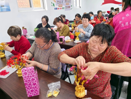 热身过后,活动进入核心环节。老师细致讲解并示范了如何运用色彩斑斓的花瓣、精致的花蕊、象征财富与好运的铜钱、坚韧闪亮的金属丝线,以及小巧可爱的元宝盆景元素制作“发财树”。在老师的耐心指导和志愿者的协助下,大家全情投入,手指翻飞间,一根根丝线巧妙地串联起铜钱与元宝,花瓣与花蕊被精心点缀其间。“发财树” 的枝干逐渐成型、丰满,最终一盆盆寄托着对生活热爱与美好期许的“发财树”手工作品在大家手中诞生。