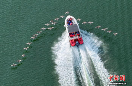 8月20日,在安徽省黄山市歙县深渡镇,游客搭乘快艇破浪而行,数十只经专业训练的鸿雁展翅凌空、优雅伴飞,与青山碧水相映成趣,共同勾勒出一幅人与自然和谐共生的生态画卷。施亚磊 摄