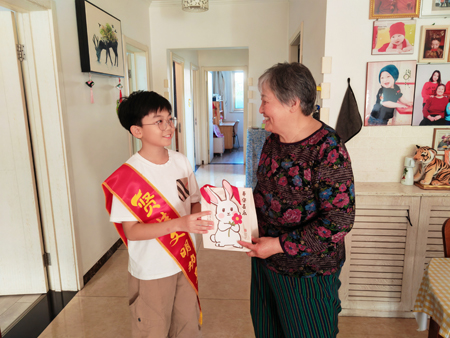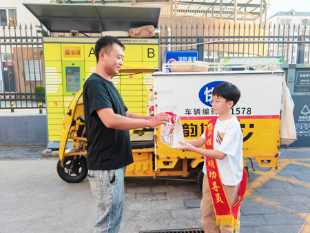 最暖心的时刻当属“月饼传情”环节,但见“贤娃”们纷纷将自己亲手制作的月饼装进社区准备的中秋礼盒,随后,“贤娃”们有的跟着社区工作人员敲响邻居家门,送上“自制月饼+节日祝福”;有的则跑到小区门口,将还带着温度的月饼递给正在清扫路面的环卫工人和正在分拣快递的小哥。“这是我第一次做月饼,请您尝尝好吃不。”接过“贤娃”递来的月饼,快递员王师傅笑着说:“这月饼比买的还甜,吃了它心里暖暖的,谢谢孩子们了。”