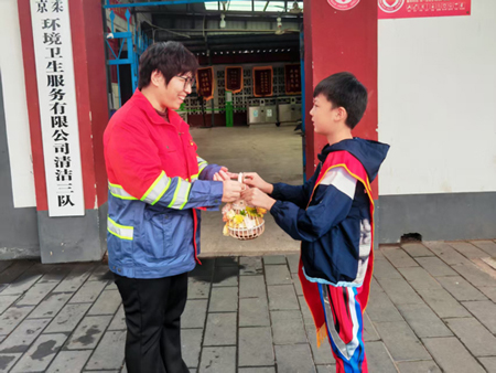 一个多小时后,一个个灵动可爱的“玉兔珍珠灯笼”新鲜出炉。随后,孩子们提着灯笼分成几组,在社区工作人员的带领下,走上街头,有的跑到小区门口,把灯笼递给正在分拣包裹的快递小哥;有的追着清扫路面的环卫工人,踮着脚把灯笼递过了去;还有的在路口找到外卖骑手,送上灯笼时还不忘说一声“叔叔辛苦啦,祝你们国庆、中秋快乐!”接过灯笼的快递员张师傅笑着说:“这灯笼又好看又暖心,感觉国庆、中秋更有滋味了!”