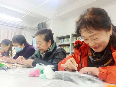 更有趣的是,手工环节的开启。志愿者们早已在同一活动室备好各色毛线、钩针、剪刀等工具,在他们的耐心指导下,居民们围坐一起,专注于手中的创作。只见钩针在素色手套上翻飞,红的线勾勒出小浆果,黄的线盘成雏菊花心,绿的线绕出卷曲叶片,粉紫的线织成小巧花瓣。不大功夫,素色的手套上,有的缀满了俏皮的小瓢虫,有的爬上了灵动的藤蔓,还有的卧着憨态可掬的小雪花。参与者每完成一幅图案,周围就会响起一阵赞叹声。就这样,指尖的温度驱散了冬日寒意,更让手工创作的快乐在彼此间传递。