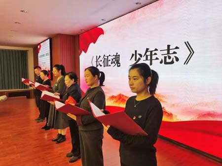 接下来,怀柔区教育关工委思政督导员、退休教师宋学淑与学校思政教师代表共同献上了诗朗诵《长征魂 少年志》。她们的深情朗诵,如同完成了一场跨越时空的精神对话,将长征精神与青春志向紧密相连,激昂的朗诵震撼人心,回荡在会场上空,表达了师生们继承先烈遗志、开创美好未来的坚定决心。