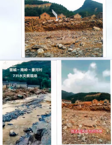 天灾人祸,人为因素是主要原因。我们有灾后拍摄的三组多幅视频录相和照片,后又用无人机航拍了造成水灾事故的曹河村上游冶底河全貌,呈现出人造“堰塞湖”溃坝处和二级路断路一年多后在溃坝处跨河新建的恢复交通的沟东大桥的精准位置和景象,呈现出寺楼底村人造养鱼水库溃坝处和大块坝体的景象,呈现出曹河村东的富晋大桥上下游,灾前私人违规造地100多亩种有庄稼的壮观景象,和灾后河道恢复原貌的景象。这三处证据形成一体化链条化,还原水灾事故的真相,都是永远存在的铁证。
