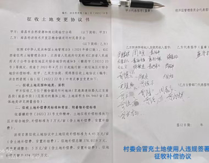 建设中的京港高铁(昌九客专)征用樵舍镇连环村曾家小组部分土地,其中包含我家持证耕种40多年(上交农业税几十年)合法自留山土地3亩多被征用。在我毫不知情的情况下,连环村委会负责人两次冒充(我)土地使用权人,违规与樵舍镇政府签署《征收土地补偿协议》和《征收土地变更协议》,显然属于程序违法。