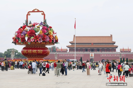 天安门广场“祝福祖国”巨型花篮吸引民众