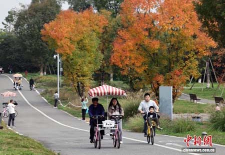 11月8日,四川省成都市青龙湖湿地公园的红枫、梧桐等树木褪去绿衣,换上彩妆吸引市民前来赏秋。
