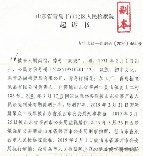 随后顾尚福、顾尚荣、迟尚飞、刘学涛等20人涉嫌组织、领导、参加黑社会性质组织罪被起诉到法院,山东省青岛市市北区人民检察院对顾尚福等人的《起诉书》认为,顾尚福等为首的涉嫌黑社会性质的组织要对聚众斗殴、故意杀人、故意伤害、寻衅滋事、开设赌场、非法采矿、强迫交易等多项罪名承担法律责任。现在该案已经进入审判阶段。