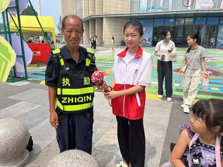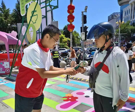 随后,志愿者们带着艾草锤,走向烈日下的街头。在公交站台,他们将艾草锤送到疏导客流的叔叔阿姨们的手中;随即他们又走到街边,小心翼翼地将艾草锤递给汗流浃背的环卫工人;在路口,当路过的外卖骑手接过带着艾草清香的礼物时,不禁感慨道:“这带着手温的物件,比空调还温馨。”