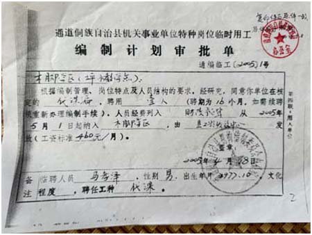 其一,铁证链条清晰证明我已是“准公办教师”。《通道县机关事业单位临工编制计划审批单》(通编临工[2005]1号)明确显示:批准木脚乡学区聘用“马某泽”为教师,聘期16个月,工资由“县财政核拨”(标准460元/月)。此文件彻底证明,我的身份绝非普通代课教师,而是经编办批准、财政供给的计划内临聘教师,离转正仅一步之遥。