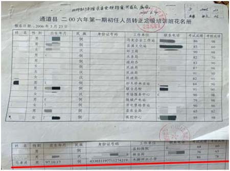 《通道县2006年第一期初任人员转正定级培训班花名册》证明,我于2006年3月参加了官方转正培训并通过考核(成绩86+78)。此培训是转正的必备程序,名单上有各县直单位及学校人员,唯我一人被区别对待。