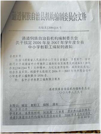 《关于核定2006至2007学年度全县中小学教职工编制的通知》(通编发[2006]18号)明确核定全县编制总数为1956名,其中木脚学区编制为19名。而我所持有的2005—2006年由县财政发放工资的条子,正好是19人。我当时领取的财政工资,正是这19个核定编制内的经费。我的名额,白纸黑字,就在这1956个编制总额之中,占用了木脚学区的其中一个指标。2006年秋季撤点并校时,教育局必须且只能将我这名“在编在岗”的教师进行分流安置。任何“编制已满”、“无法安置”的借口,在此份文件面前都是彻头彻尾的谎言。