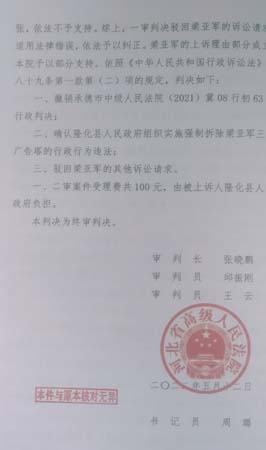 我们开始敦促政府方面出具文件或材料,他们不出。通过报案、起诉、信息公开申请等,在一年后的2020年5月,县政府办把省、市、县三级文件邮寄给我。但是我拿着文件二次去市中院申请立案,刘某某依然告诉我还是实行“三不”。这样一年的功夫白费了,律师也感到无奈。无奈向上级有关部门反映情况,2021年5月底,上级否定了法院的“三不”,6月7日正式立案。已经过去两年,律师代理两年的期限已经过期。2021年12月份,接到市中院判决,驳回诉讼请求。省高院“(2022)冀行终58号”二审判决,确认县政府组织实施强拆广告塔的行政行为违法,但没有判决政府赔偿损失和给付广告费用。所有法律程序包括再审、检察机关监督,都走完了,也都是不支持。上级巡视组督办,三次把申诉材料退回省高院和市中院,两级法院的行政庭仍然坚持自己的观点。