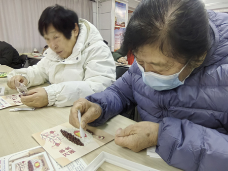 讲解结束后,大家立刻投入创作,现场氛围温馨又惬意。有的居民先用小米铺出腊八粥碗的基底,再用红豆沿着碗边点缀,既层次分明又好看;有的专注地用绿豆、玉米碴搭配,一点点填补图案空隙,耐心打磨每一处细节;还有的邻里围坐在一起,互相请教粘贴手法,分享各自的创意,不时传来阵阵欢声笑语。老年居民们沉下心来,慢慢摆弄着每一粒杂粮,在锻炼手部精细动作的同时,也把对新年的美好祈愿细细融入作品之中。不一会儿,一幅幅充满烟火气的五谷拼贴画新鲜出炉,每一粒平凡的谷物,都化作了承载祝福的吉祥符号。