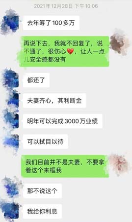 “2021年6月30日,他说公司资金周转不开,跟我说‘只有最亲密的人才有最好的金钱关系’、‘不会让你有损失’,让我帮他贷款,后来在他的带领下,前往江苏银行北京安定门支行办了29.9万的贷款,取现22万转到了他的建行账户,剩下的也以‘借款’名义转给他;同年12月17日,他声称要投‘海南休博会’项目,又让我贷款,说他‘第一次求人’,愿意把房子抵押给我,又让我在民生银行北京金融街支行贷了30万,我分两笔转了24.9998万给他,但也没见有啥项目落地。”到2022年底,咏卿说此时已经贷款5笔,金额达139.60万元。